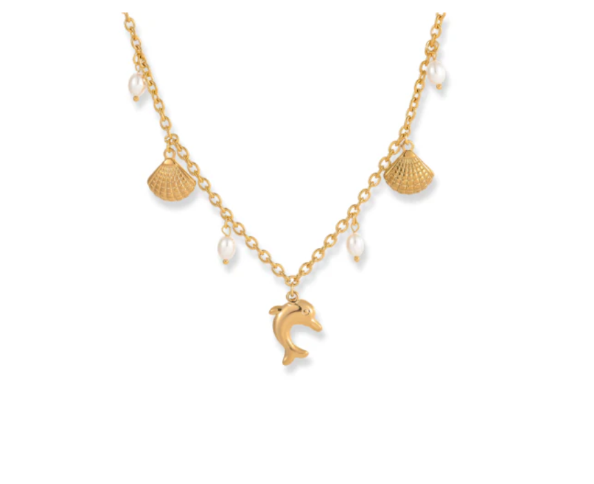 The Dolphin Charms Necklace features playful dolphin charms on a durable chain, offering a fun and ocean-inspired accessory for any outfit. Crafted for everyday wear, it adds a touch of coastal elegance that enhances both casual and layered looks. Wear it alone for a statement piece or combine it with other jewelry to create a personalized, marine-themed style.