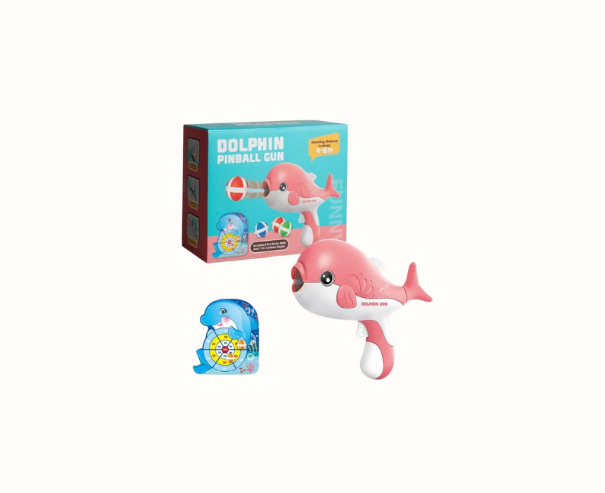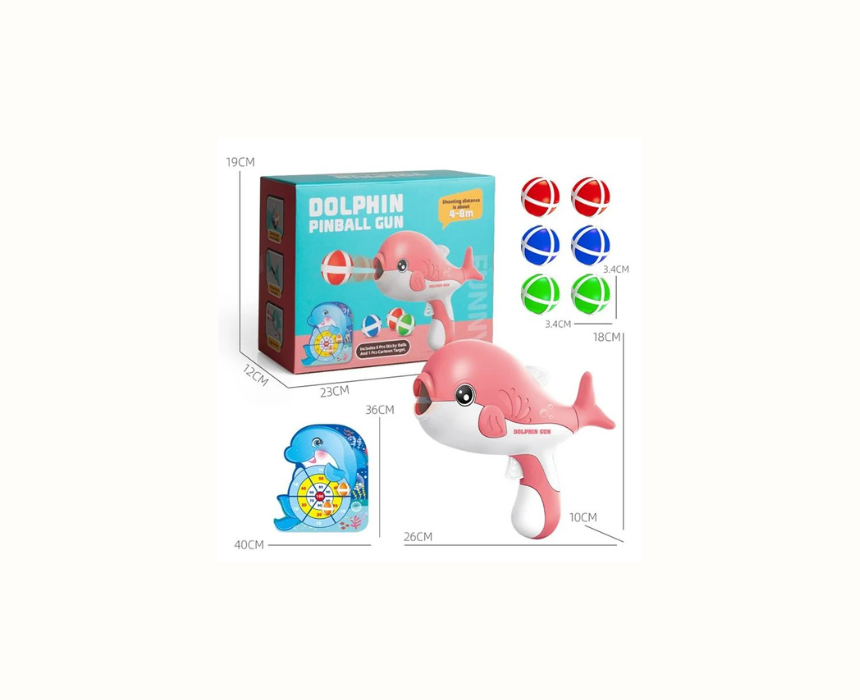 The Dolphin Pinball Gun is a fun shooting toy that uses sticky balls as ammunition. The set includes a launcher gun, six sticky balls in red, blue, and green, and a cartoon dolphin target with a numbered dartboard pattern. Suitable for children aged 3 and up, it encourages hand eye coordination and target practice fun.