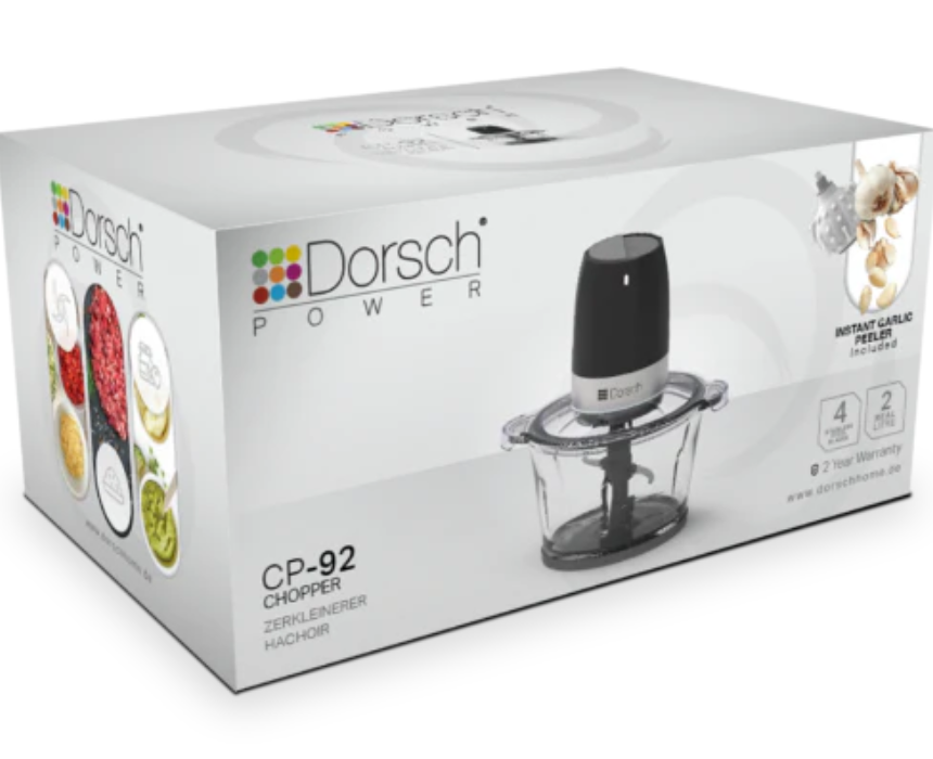 The Dorsch Chopper 300W DH-07211 is a compact, high-power kitchen appliance designed for versatile food preparation, featuring a 2L glass bowl and a 300W motor for efficient chopping, slicing, shredding, and mixing. It includes safety mechanisms to prevent accidental operation, intuitive controls for easy use, and removable attachments for effortless cleaning. Ideal for small kitchens, it comes with a garlic chopper and silicone peeler for precise, convenient ingredient preparation.