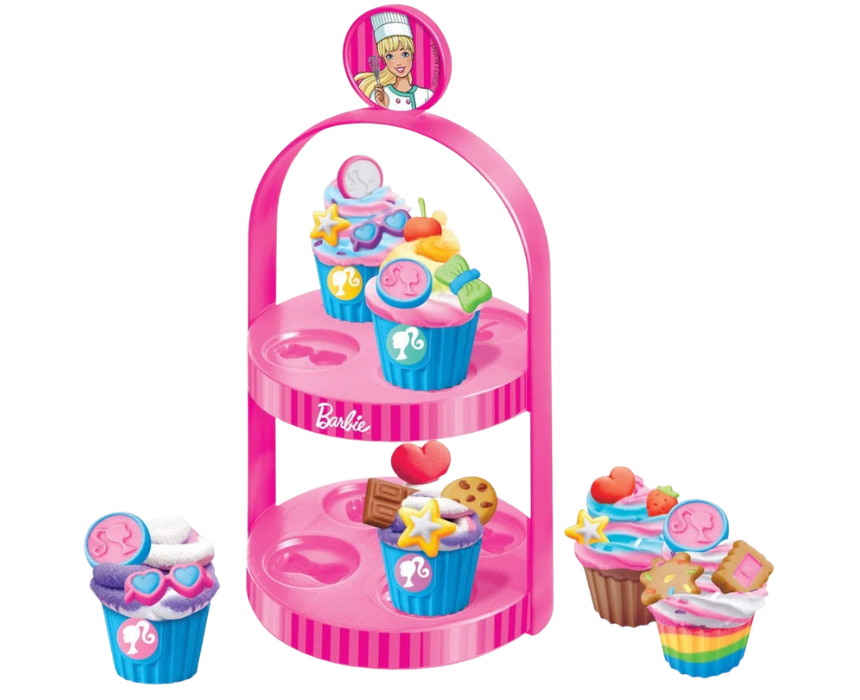 The Cra-Z-Art Barbie Dough Bakery Cupcake Maker lets kids craft their own Barbie Softee Dough cupcakes with ease. Simply pull, twist, and roll the dough to create sweet treats, then display them on the included 2-tier cupcake stand. The set includes four tubs of Softee Dough and fun press moulds for shaping, providing hours of creative play for children aged 3 and up.