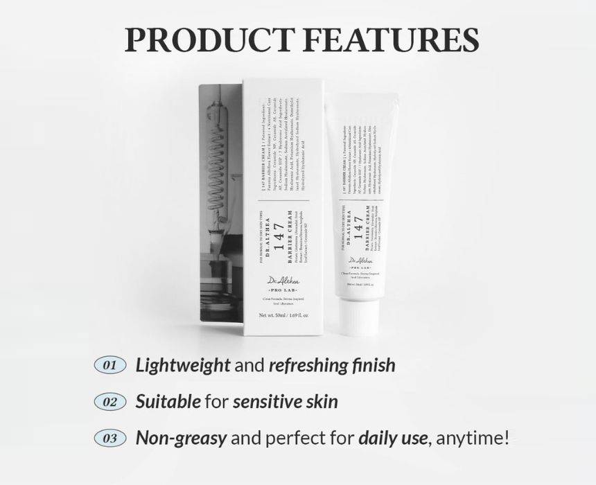 Dr. Althea 147 Barrier Cream (50 ml) is a nourishing skincare solution formulated to strengthen the skin barrier and provide deep hydration. Enriched with patented Paeonia Albiflora Flower Extract, avocado fruit extract, argan oil, camellia seed oil, and tocopherol, it delivers soothing effects and anti-aging benefits through its seven-layered hyaluronic acid composition. For best results, apply after cleansing and toning as the final or semi-final step in your skincare routine.