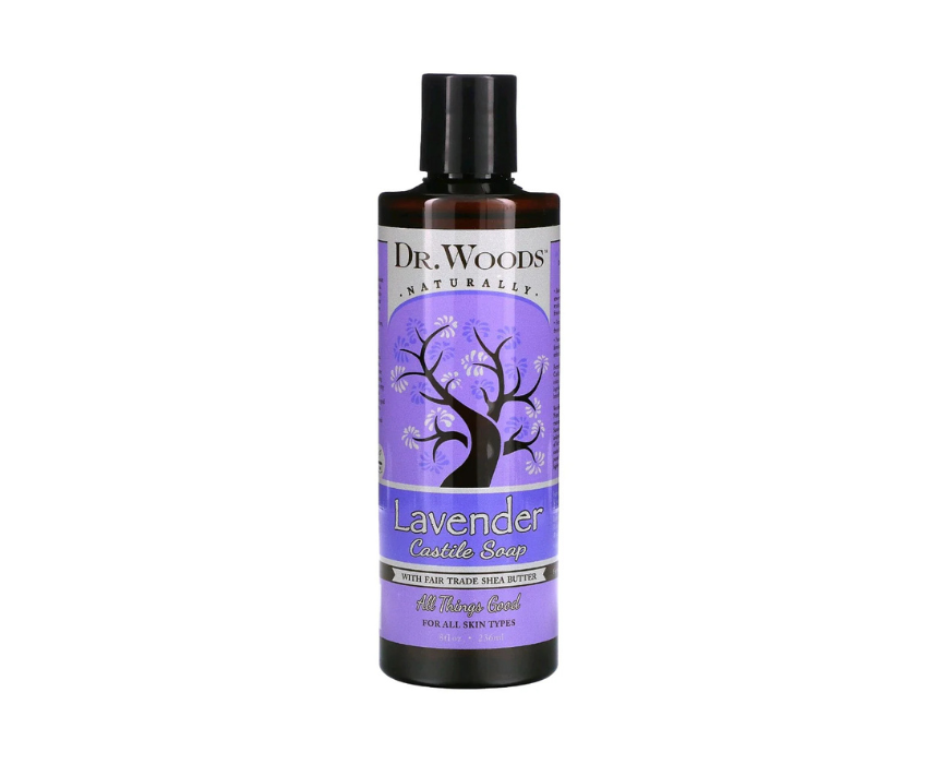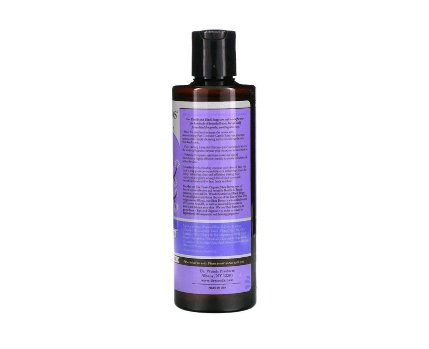 Dr. Woods Lavender Castile Soap Shampoo with Fair Trade Shea Butter is a 236 ml gentle, all natural cleanser for face, body, and hair. Vegan, gluten free, cruelty free, and free of parabens, sulfates, and petroleum derivatives, it soothes and moisturizes skin while the calming lavender oil eases tension. Formulated with coconut, olive, and shea butter, it produces a rich lather for a refreshing, therapeutic clean suitable for all skin types.