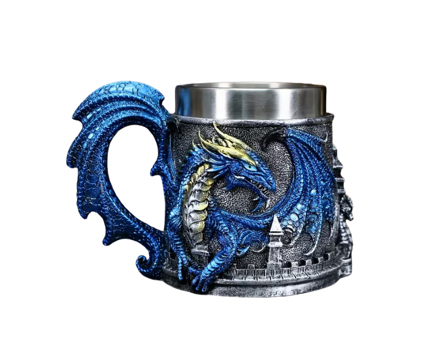 The Dragon-Guarded Castle Mug features a detailed castle design guarded by a dragon and pterosaur, with a durable stainless steel inner cup. With a 15.2oz capacity, it’s perfect for beer, coffee, or cold drinks. Ideal for fantasy enthusiasts, dragon collectors, and as a unique gift or themed décor item.