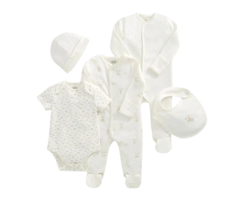 The Duckling Outfit Set (5 Piece) is a cosy and practical unisex collection for newborns, crafted from soft, breathable cotton to keep little ones comfortable. The set includes two long-sleeved sleepsuits, a long-sleeved bodysuit, a matching bib, and a hat, all featuring charming duckling prints and popper fastenings for easy dressing and nappy changes. Perfect for layering or wearing individually, this set keeps babies snug, stylish, and ready for everyday wear.