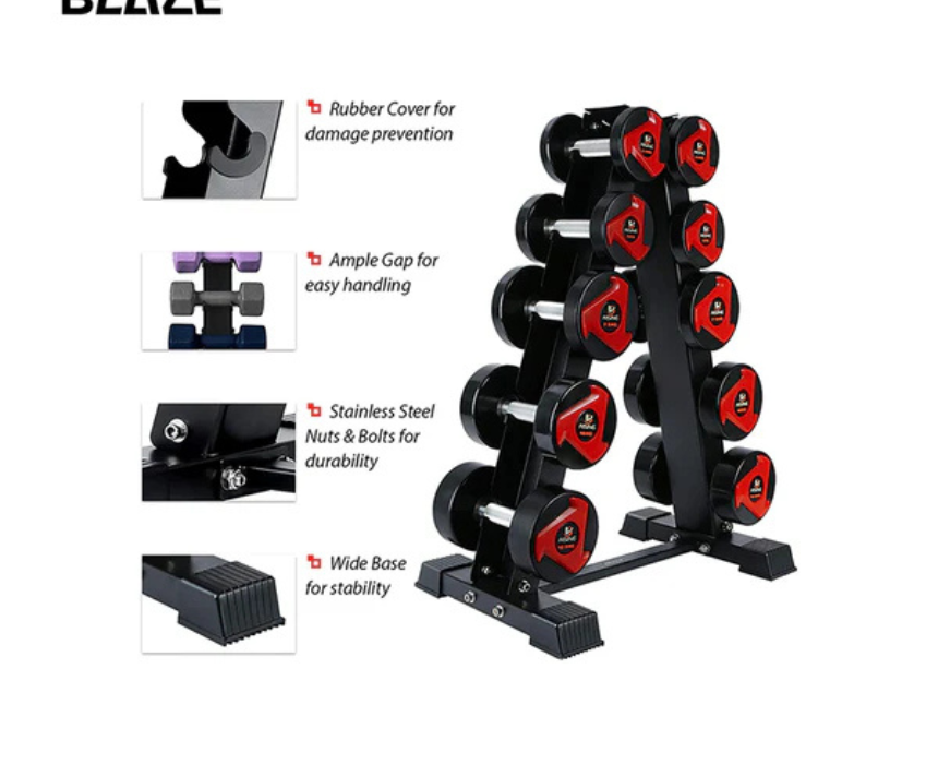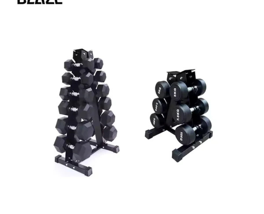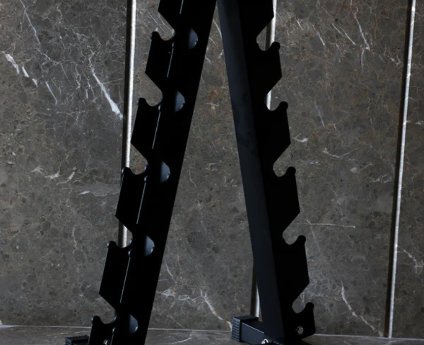 The Blaze Dumbbell Rack is a heavy-duty steel storage solution available in 3-pair and 6-pair configurations, designed to hold hex, vinyl, rubber-coated, and standard dumbbells securely. With angled shelves, a stable anti-slip base, and a compact design, it keeps workout spaces organized, protects equipment, and allows easy access for efficient training. To style, place it against a wall in a home or commercial gym for a clean, professional setup.