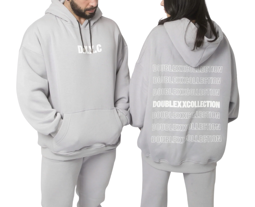 The DXXC Hoodie in silver grey is a premium oversized hoodie for men and women, crafted from high-quality 3-fleece fabric for exceptional comfort and durability. It features a bold semi-large “DXXC” print on the front mid-chest and a striking repetitive “DOUBLEXXCOLLECTION” print on the back for a standout streetwear statement. Style it with joggers, jeans, or cargo pants for a modern, urban-inspired look.