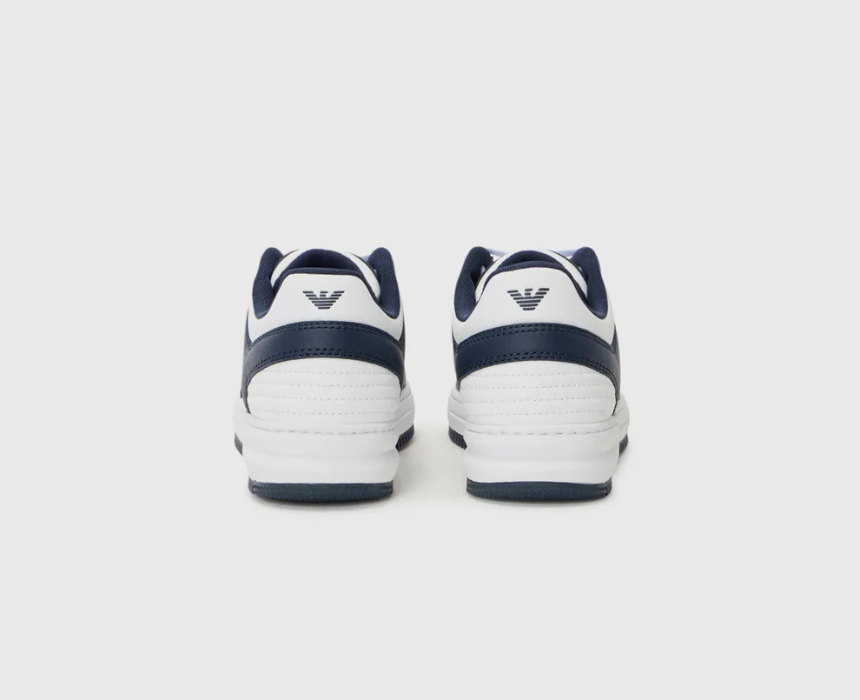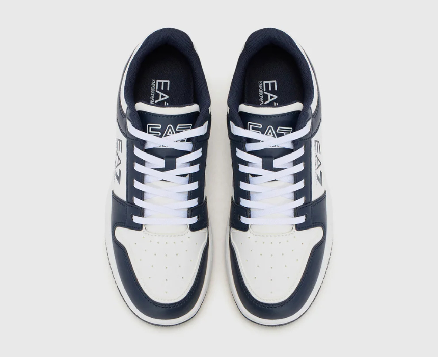 These EA7 Emporio Armani sneakers combine a sleek white upper with bold blue accents for a clean, premium streetwear look. Originally designed in Italy and imported from Europe, they feature lightweight breathable construction and a cushioned sole with signature EA7 branding for all day comfort. They pair effortlessly with jeans, joggers, or casual outfits for a sharp everyday style.