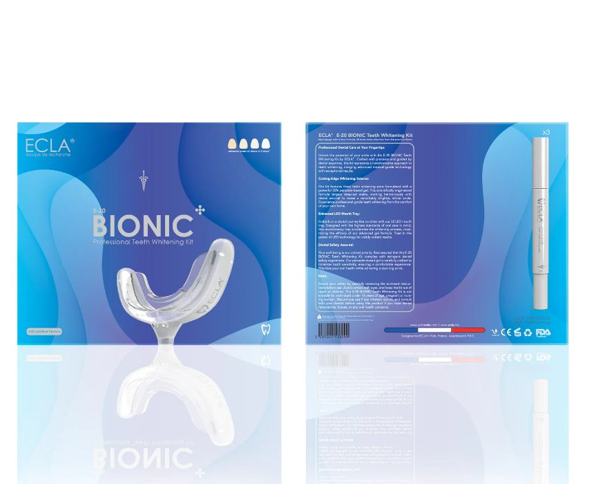 The ECLA E20 Bionic⁺ Kit features a dentist-grade formula with Carbamide Peroxide to deeply whiten teeth at home. Apply the gel using the precision pen on clean, dry teeth, insert the plug-in mouth tray, wait 30 minutes, then rinse for a noticeably whiter smile with minimal effort.