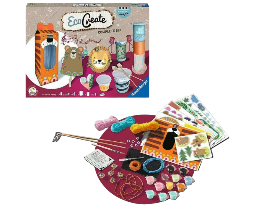 The Ravensburger EcoCreate Make Your Own Music Set allows children aged 6 and up to craft musical instruments using recycled materials from home. The set includes child-friendly craft supplies and easy-to-follow instructions to create upcycled DIY projects, combining creativity with sustainability. Eco-friendly packaging and collaboration with Fairventures for global reforestation make this a fun and responsible craft activity.