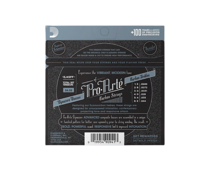 D’Addario EJ45FF Pro-Arte NT Carbon Classical Guitar Strings combine Dynacore basses and fluorocarbon trebles for bright, projecting tone and precise intonation. This normal tension set offers balanced playability, rich sound, and dynamic projection, ideal for live performance, studio recording, and classical guitar.