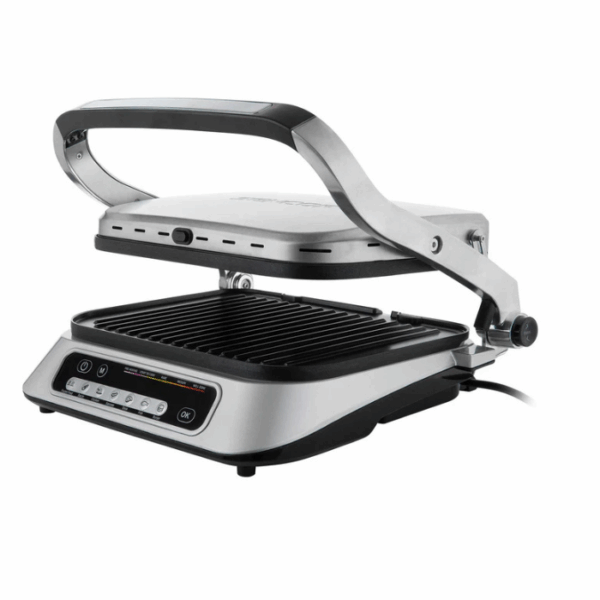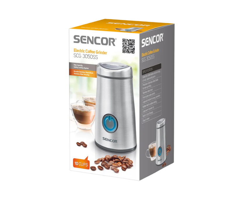 This stainless steel electric grinder is designed for grinding coffee beans, walnuts, herbs, poppy seeds, and spices, featuring a 50 g hopper suitable for up to 10 cups of coffee and a 150 W motor with shatter knife grinding system. It includes anti slip feet for stability, adjustable grind fineness based on grinding time, built in power cord storage, and compact dimensions of 104 x 104 x 192 mm with a weight of 800 g. Ideal for kitchens and coffee corners, it is best used on a flat surface and pulsed to control grind texture for espresso, filter, or spice use.