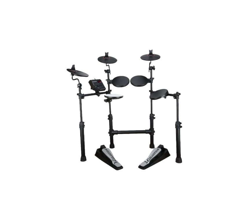 The Carlsbro 7-piece electronic drum kit features the Commander 100 sound module, 4 responsive 7-inch drum pads, 3 versatile 8-inch cymbal pads, and 2 foot pedal controllers for realistic bass drum and hi-hat simulation. Complete with a height-adjustable telescopic frame and Carlsbro drumsticks, this kit is perfect for home practice or studio sessions, offering a compact, quiet, and professional drumming experience.