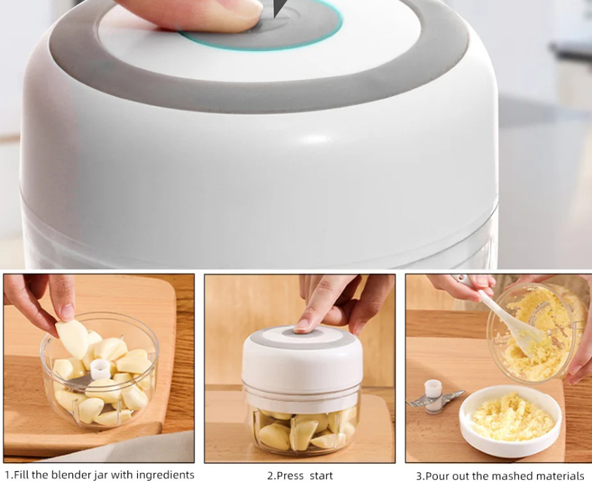 The Electric Kitchen Food Chopper & Grinder is a compact, portable tool perfect for quick and efficient chopping of garlic, vegetables, herbs, spices, and small portions of meat. USB rechargeable and cordless, it features sharp stainless-steel blades, one-touch operation, and detachable parts for easy cleaning. Made from durable materials, it offers convenience and long-lasting performance for any kitchen.