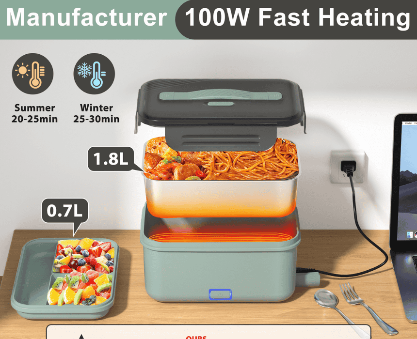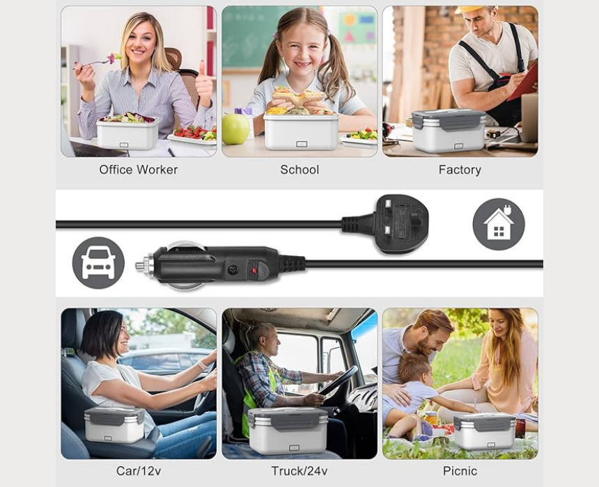 This multifunction electric lunch box is a portable 100W food warmer with a large 1.8 L removable 304 stainless steel container that heats meals evenly in about 20 to 30 minutes. Made from food safe high temperature PP plastic and food grade silicone with a leak proof design and thermal bag, it is easy to carry and ideal for office work travel or driving and can be styled neatly in a bag for daily use.