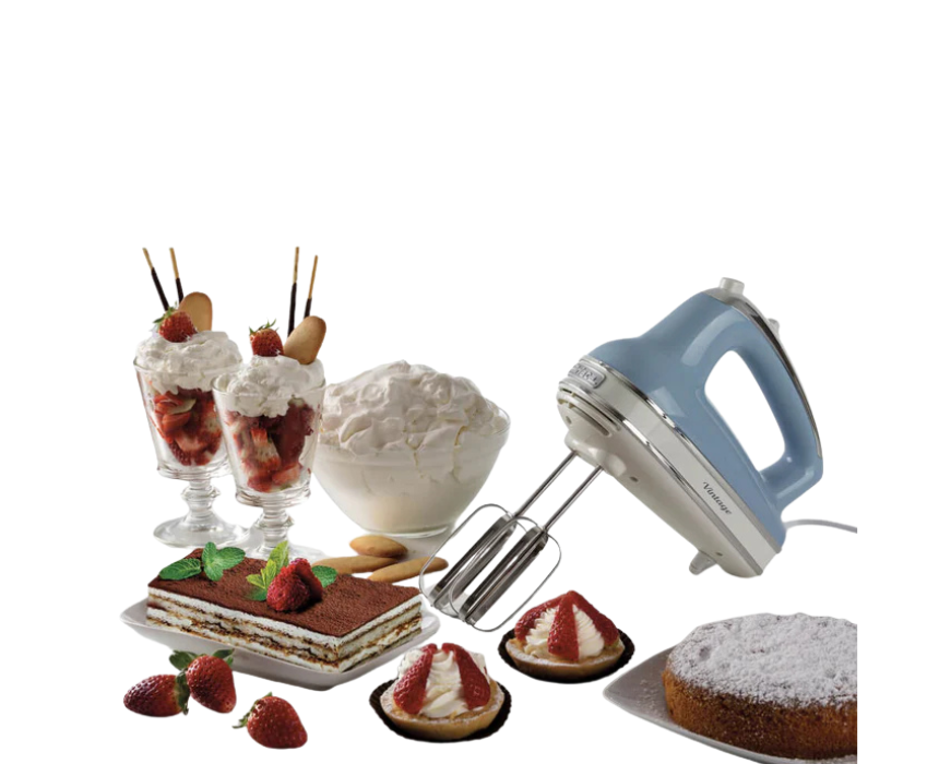 The Vintage Electric Mixer is a 450W multifunction mixer designed to speed up processing and improve ingredient homogeneity. With 5 speeds plus a Turbo function, it comes with two electric whisks for whipping and kneading, making it ideal for cakes, bread, pizza dough, and whipped cream. Its vintage design, ergonomic handle, and easy-extract whisks combine style and functionality for effortless baking at home.