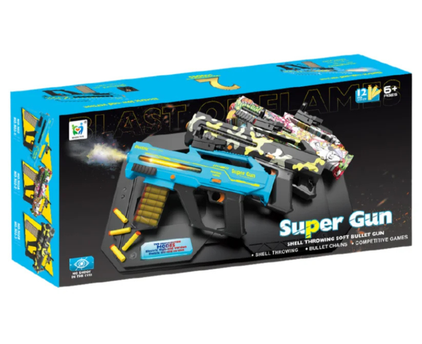 This electric soft bullet gun features a shell-throwing mechanism, built-in flashlight, and spray/smoke effects for realistic and safe play. Designed for high-energy fun, it provides interactive action for young shooters and can be styled with protective gear or themed play outfits for immersive games.
