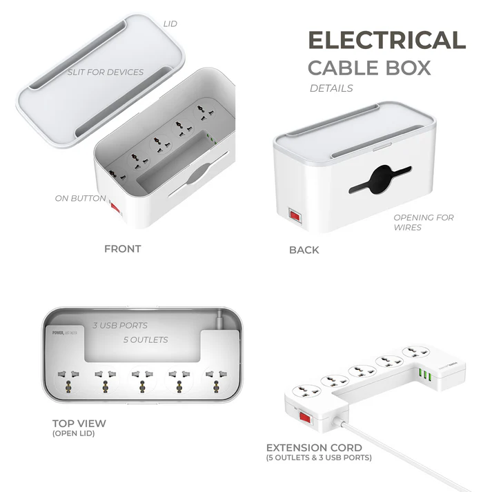 Product dimensions: 29 cm x 14 cm x 13.5 cm. Package dimensions: 30 cm x 14.4 cm x 14.5 cm. Material: High grade heat resistant plastic. Electrical specs: 2500W 10A 110-250V rated power with 5 universal outlets. USB specs: 3 ports with 15.5W power and 5V 3.1A output featuring Smart IC. Safety features: Fire resistant housing and short circuit protection. Warranty: One month exchange policy. Usage: Place power strips inside and use the lid slit to display devices while charging.