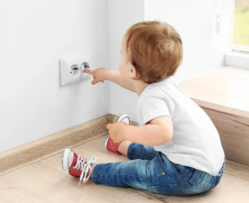 Child safety electrical outlet cover designed with a rotating system that blocks access to socket openings while still allowing normal everyday use when needed. It installs easily into type C and type E outlets using optional adhesive tape, and can be unlocked using a standard plug for convenience. The discreet white design helps blend into home interiors while improving household safety for children.