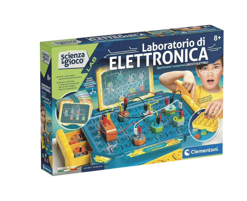This electronics laboratory kit introduces children to the exciting world of electricity with 18 modules and pre-mounted components to build fully functioning circuits. Using patented Italian-made parts, kids can safely connect wires and modules on a special workbench to light up circuits and activate sensors, learning electronics through hands-on experimentation. The kit develops problem-solving skills, creativity, and a deep understanding of electrical principles while having fun.