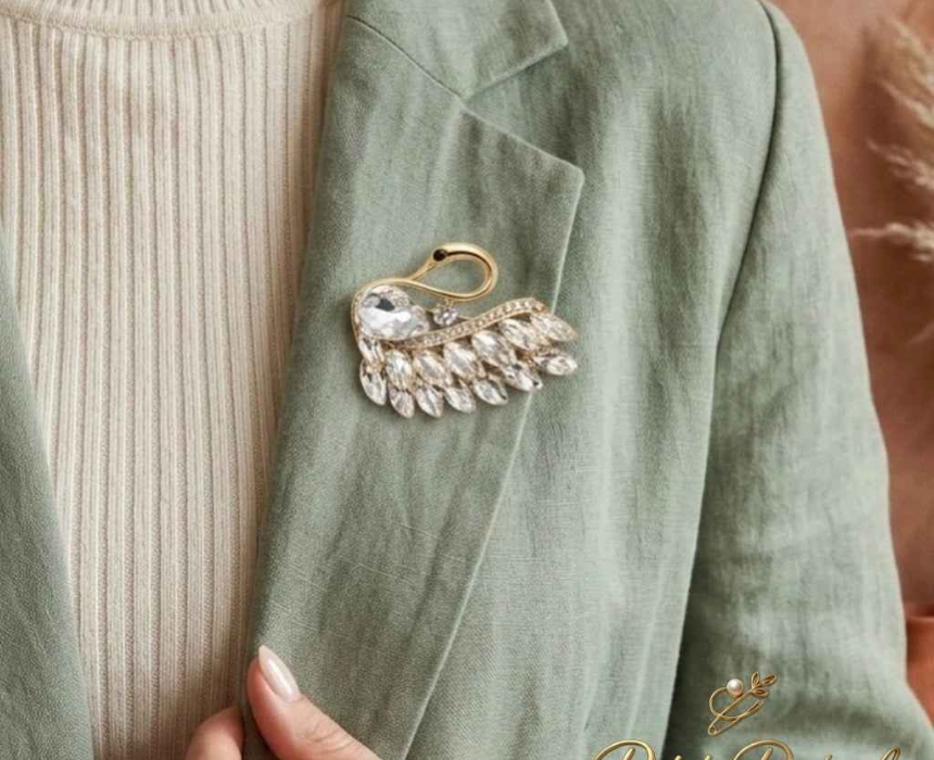 This elegant gold and crystal swan brooch features a graceful design with a polished finish and sparkling accents, secured with a reliable pin backing for comfortable wear. Ideal for styling on blazers, dresses, scarves, or handbags, it adds a refined and timeless touch to both casual and formal outfits. Lightweight and versatile, it is perfect for everyday elegance or thoughtful gifting.