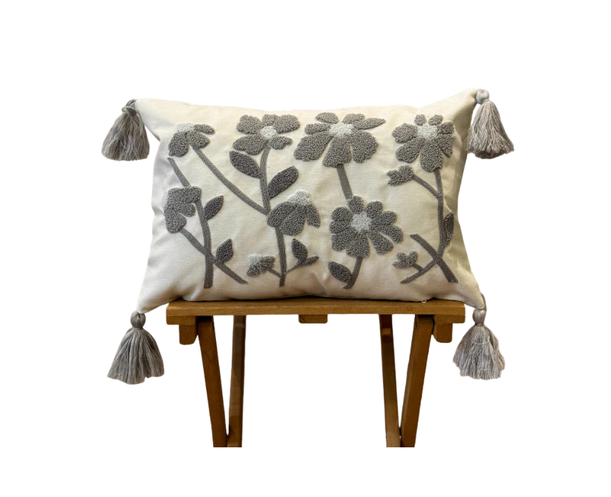 The Elegant Tufted Floral Rectangular Cushion Cover with Tassels features a soft neutral palette, textured floral tufting, and delicate corner tassels that elevate any sofa, bed, or reading nook. Its sturdy zip closure allows easy insert changes, and the rectangular shape adds stylish dimension when layered with square cushions. Pair it with warm neutrals or natural fabrics for a calm, refined look.