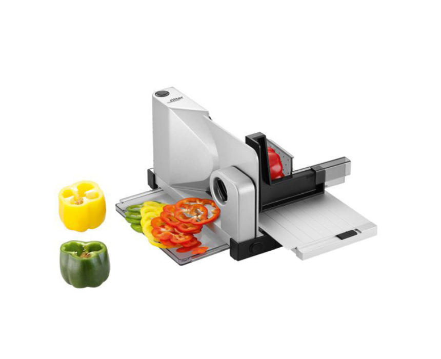 The Ritter ELEXA7 Electric Food Slicer combines power, safety, and space-saving design in a foldable full-metal construction. Equipped with a serrated stainless steel blade, adjustable slicing thickness up to 14 mm, a wide metal food plate, and a 65W eco motor, it handles bread, cheese, meats, and vegetables with ease. Features like a two-finger safety switch, divisible carriage, quick-release blade, and included food tray ensure safe, efficient, and convenient slicing for every kitchen.