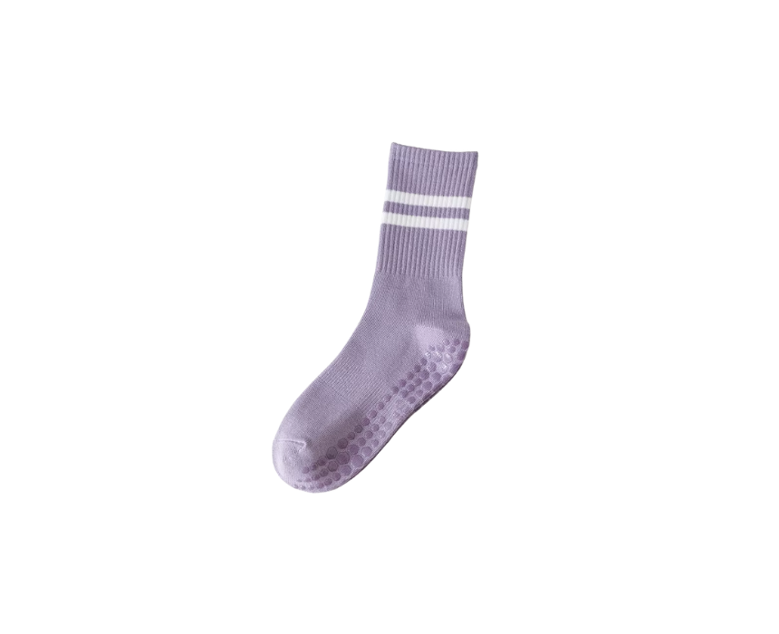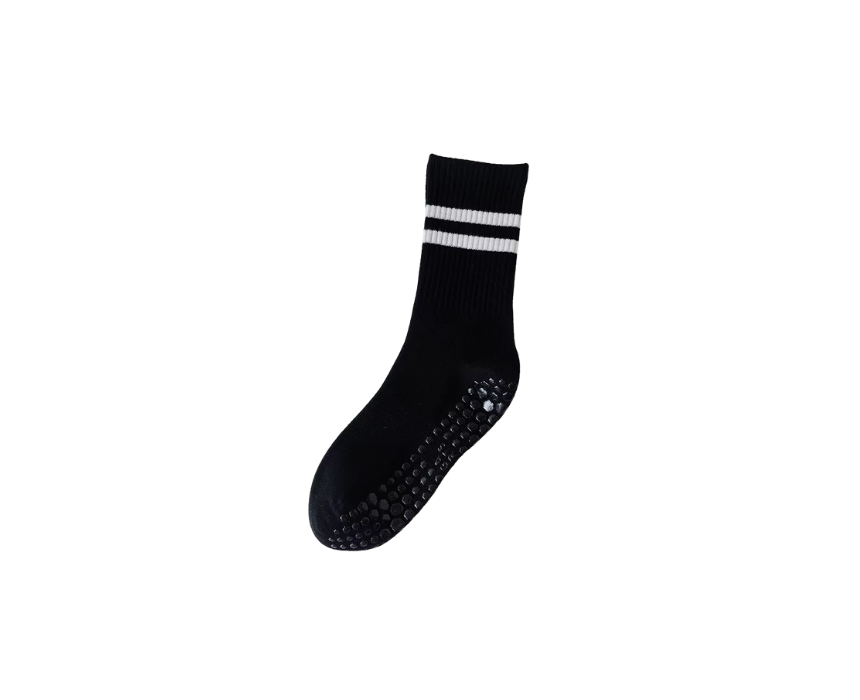 Elite Grip Stripe Socks offer non-slip silicone grips for stability during Pilates, yoga, barre, or dance, keeping feet secure on mats and studio floors. Made from a breathable cotton blend with polyester and spandex, they provide stretch and comfort for all-day wear. The sporty two-stripe design in multiple colors pairs well with leggings, workout shorts, or casual loungewear, with mid-crew ribbed cuffs that stay in place throughout activities. Machine washable for easy care.