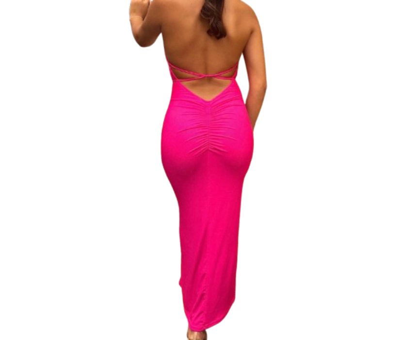 The Elitta Dress features a sleek body hugging silhouette with a striking open back and delicate strap detailing for a bold, feminine finish. Designed with ruched detailing that enhances the figure, it offers a flattering fit with elegant movement. Style it with heels and minimal accessories for summer evenings or special occasions.