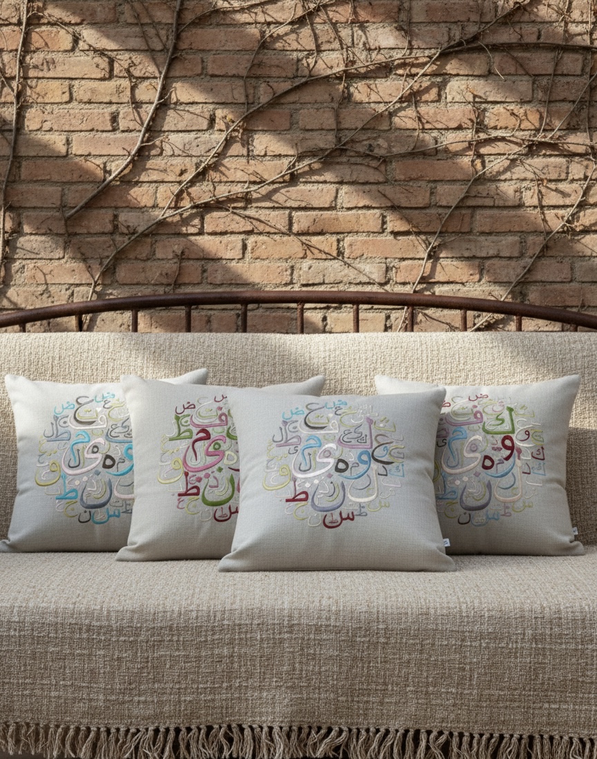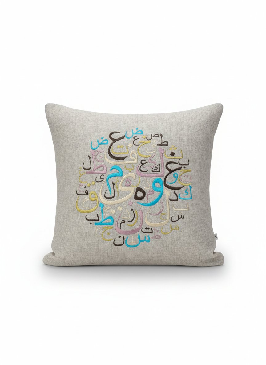 Add a sophisticated touch of Levant heritage to your home with these elegant beige linen-textured cushion covers. Each piece features an artistic circular arrangement of intricately embroidered Arabic letters in a variety of vibrant colour palettes, including soft pastels, bold teals, and multi-coloured jewel tones. These modern yet culturally rich covers serve as a perfect accent piece for any living space or as a thoughtful gift.