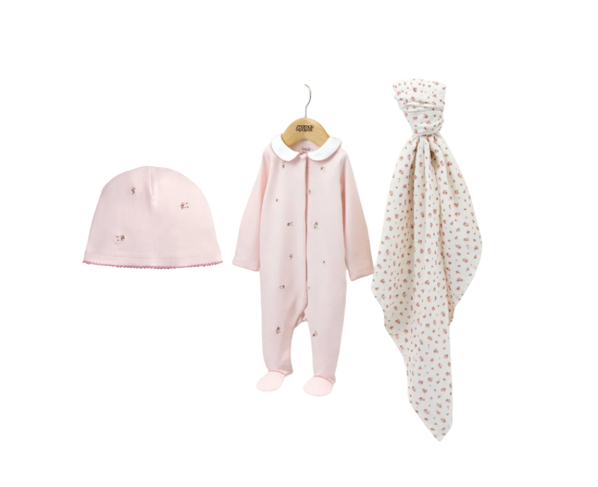 The Embroidered Romper, Hat & Blanket Set in pink from the Welcome to the World collection is a soft and stylish 3-piece outfit for newborns. Crafted from gentle, breathable fabrics, the set features delicate embroidery on the romper, a matching hat, and coordinating blanket, providing comfort and warmth. Perfect for coming-home outfits or everyday wear, it combines practicality with charming, timeless design for little ones.