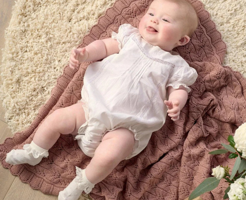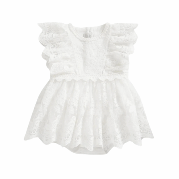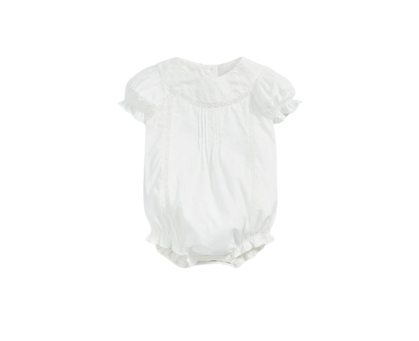 The Embroidered White Romper for babies is crafted from 100% lightweight woven cotton, featuring delicate lace with embroidery, pin tuck detailing, and elasticated leg openings for soft volume. Designed with short frill sleeves, a concealed gusset popper opening for easy nappy changes, and a back placket with pearl matte buttons, it is ideal for special occasions and celebrations. Style it with soft baby shoes or a knitted cardigan for an elegant, timeless look.