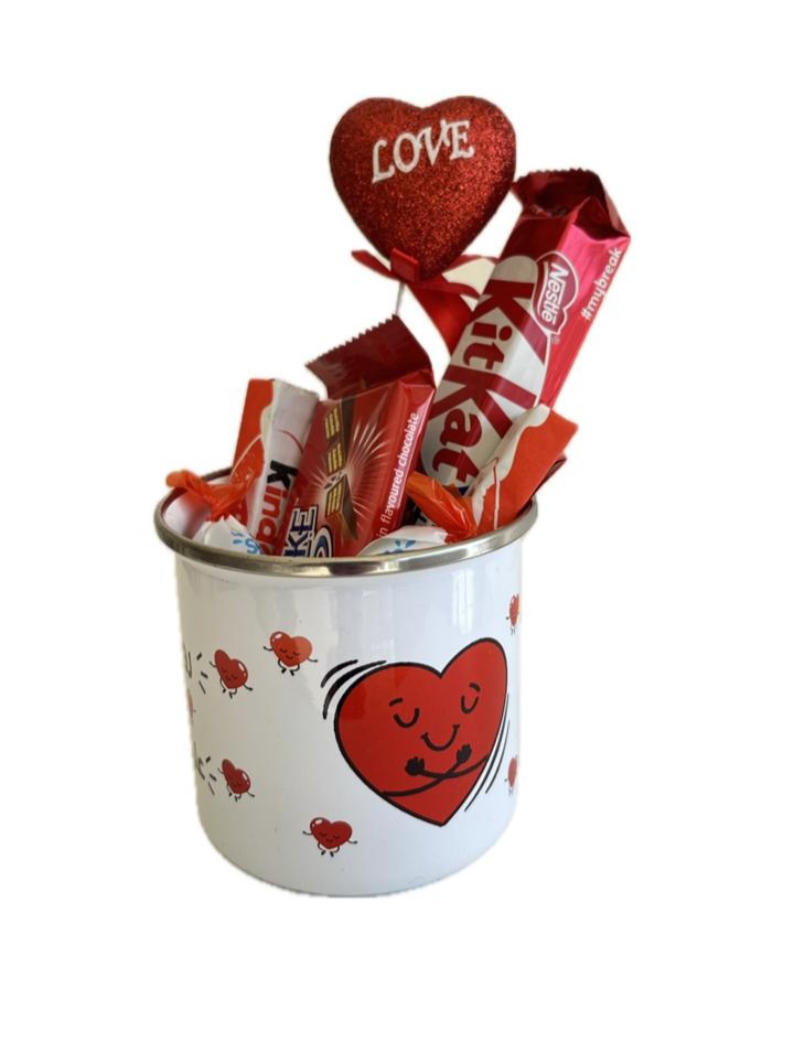 Enamel mug with a unique design, customizable with your name. Available plain or with chocolate for a sweet touch.