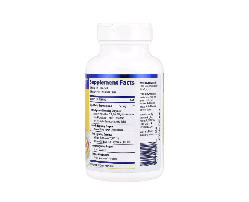 Enzymedica Digest Basic provides gentle digestive support with 180 vegan and kosher capsules. Each capsule contains Thera blend® enzymes that help break down fats, protein, carbs, fiber, and dairy, reducing occasional gas and bloating. Take one capsule with each meal to support digestive comfort and overall digestive health.