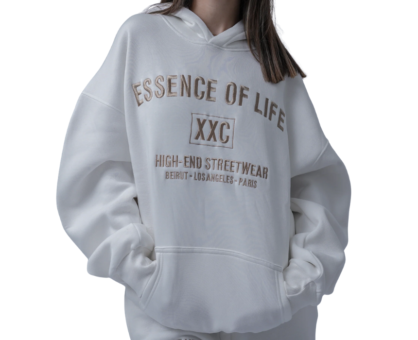 The Essence of Life Hoodie in creamy white is an oversized unisex hoodie crafted from premium 3-fleece+ fabric, offering exceptional softness and warmth. It features delicate gold embroidery on the chest for a refined, elegant touch. Perfect for layering or pairing with joggers and jeans, this hoodie delivers cozy comfort while elevating your casual streetwear style.