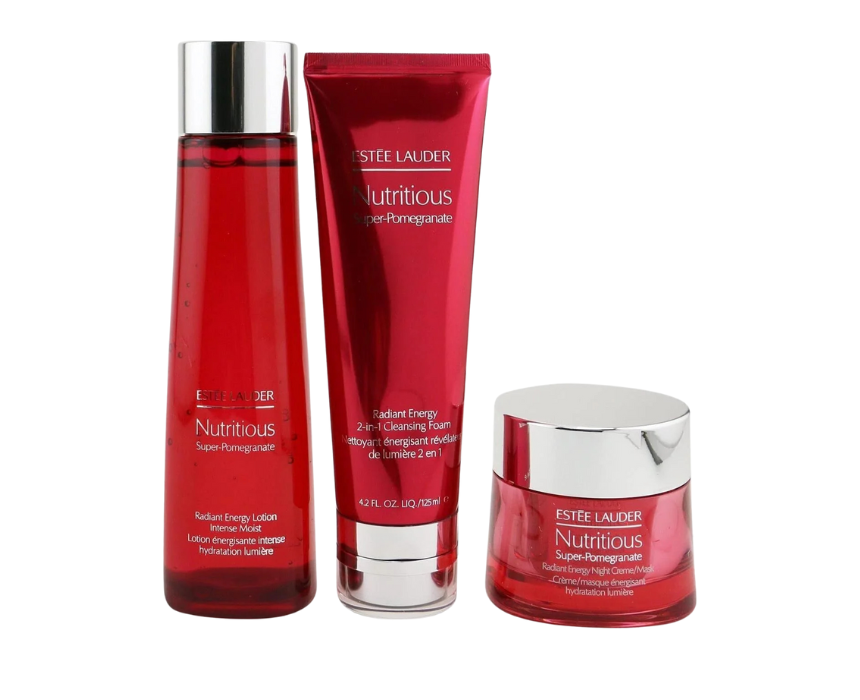 The Estee Lauder Travel Exclusive Recharge Your Radiance 3-in-1 Kit is a complete skincare set designed to cleanse, hydrate, and nourish your skin. It includes the Nutritious Super-Pomegranate Radiant Energy 2-in-1 Cleansing Foam (125ml) to purify, the Radiant Energy Lotion – Intense Moist (200ml) to deeply hydrate, and the Radiant Energy Night Creme/Mask (50ml) to infuse skin with moisture overnight. Ideal for daily use, this kit delivers clean, radiant, and plumped skin, and makes a perfect gift or travel companion.