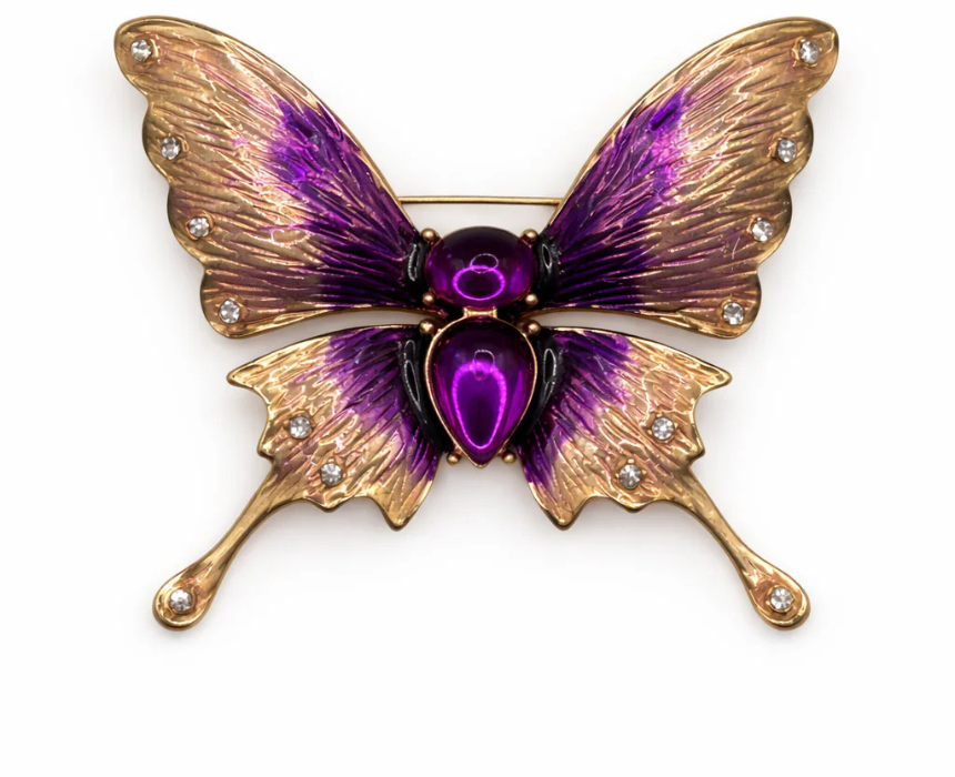 This ethereal butterfly brooch features hand painted enamel wings accented with sparkling crystals, creating a delicate and eye catching accessory. Its lightweight design allows it to be styled effortlessly on jackets, dresses, scarves, or handbags for a whimsical touch. Perfect for adding elegance and charm to both everyday outfits and special occasions.