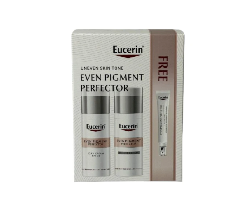 The Eucerin Even Pigment Perfector Kit helps reduce dark spots, even out skin tone, and prevent new pigmentation. It includes a Day Cream SPF 30, Night Cream, and a free Eye Care, all containing Thiamidol® to brighten and smooth the skin for a more radiant complexion.