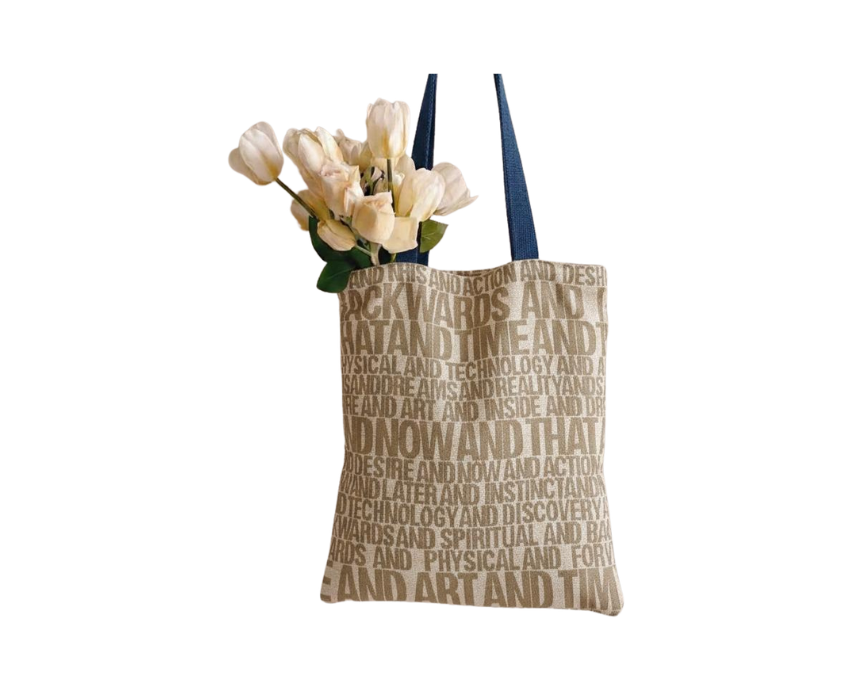 <p>This upcycled tote bag is made from beige fabric with printed text details and features sturdy dual denim handles for durability. Eco friendly and unique, it is perfect for everyday use while promoting sustainable fashion. Available in two sizes with lengths of 40 cm and 35 cm, ideal for carrying essentials in style.</p>