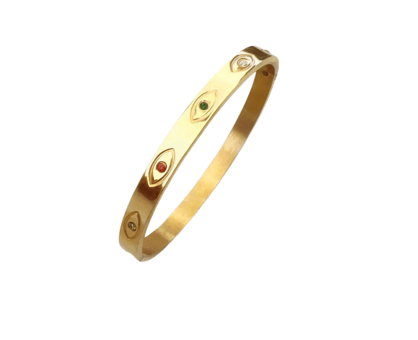 Evil Eye Bangle Bracelet features a sleek stainless steel design with the iconic evil eye charm. A stylish accessory believed to offer protection while adding a touch of elegance to everyday outfits.