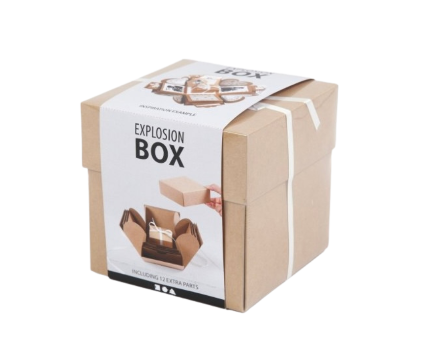The Explosion Box is a creative gift box made of sturdy cardboard that opens dramatically to reveal layered compartments and pockets for personal messages, photos, and decorative cutouts. This unique set includes a box with 12 solid pockets, 12 loose decorative pieces in 8 varieties, a mini inner box, and a satin ribbon closure. Perfect for personalized surprises, it combines gifting and heartfelt greetings in one memorable presentation.