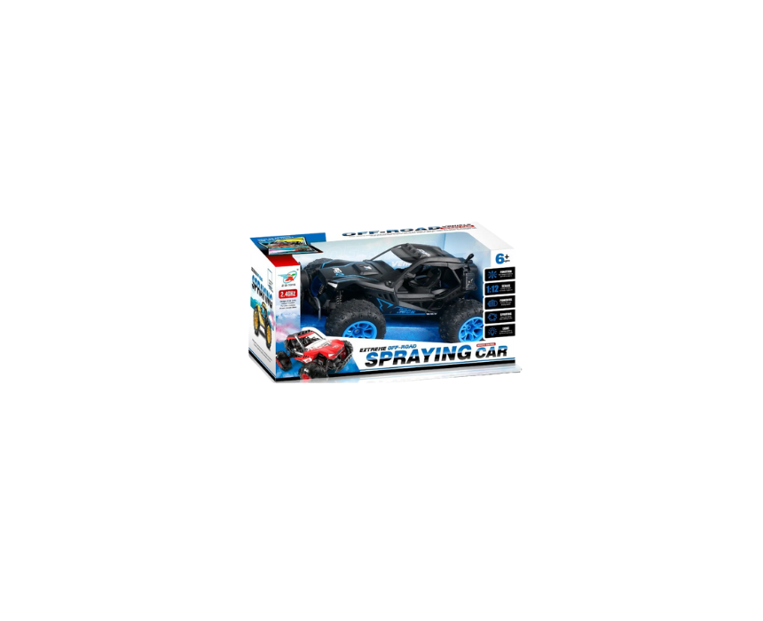 The Extreme Off Road Spraying RC Car is a 1:12 scale monster truck featuring 2.4GHz remote control, lights, and a fun spray effect for realistic off road play. Built for all terrain driving, it provides exciting action while helping kids develop coordination and control skills, and it can be displayed on a play mat or used outdoors for full adventure fun.