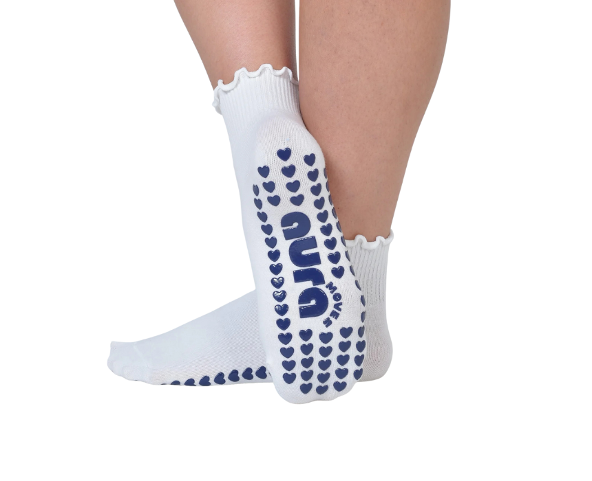 Eye See You Socks are white grip socks with blue silicone grips and an evil eye detail on the ankle, designed to hug your feet for comfort and style from studio to street. One size fits most with a soft, breathable cotton blend and non-slip sole, making them perfect for Pilates, Barre, Yoga, Lagree, and gym sessions while keeping you confident and cute every step.