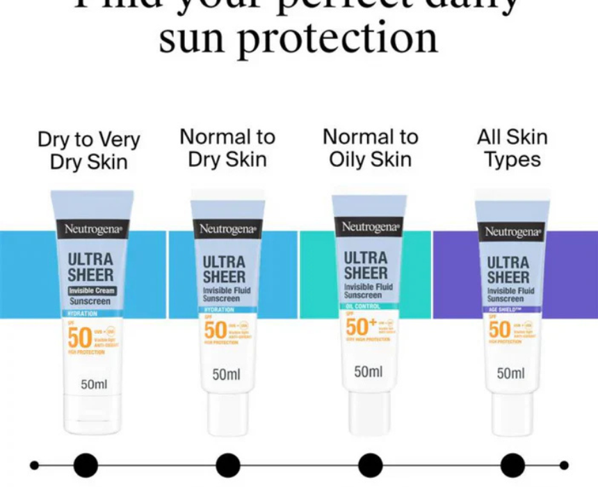 Neutrogena Ultra Sheer Invisible Hydration Fluid Sunscreen SPF50 offers high broad-spectrum protection with an ultra-light, fast-absorbing texture and invisible dry-touch finish. Powered by Helioplex SL Technology and enriched with glycerin, panthenol, pro-ceramides, vitamins C and E, and niacinamide, it hydrates for 24 hours while helping protect against premature ageing and environmental damage. Apply evenly to face before sun exposure for daily lightweight protection.