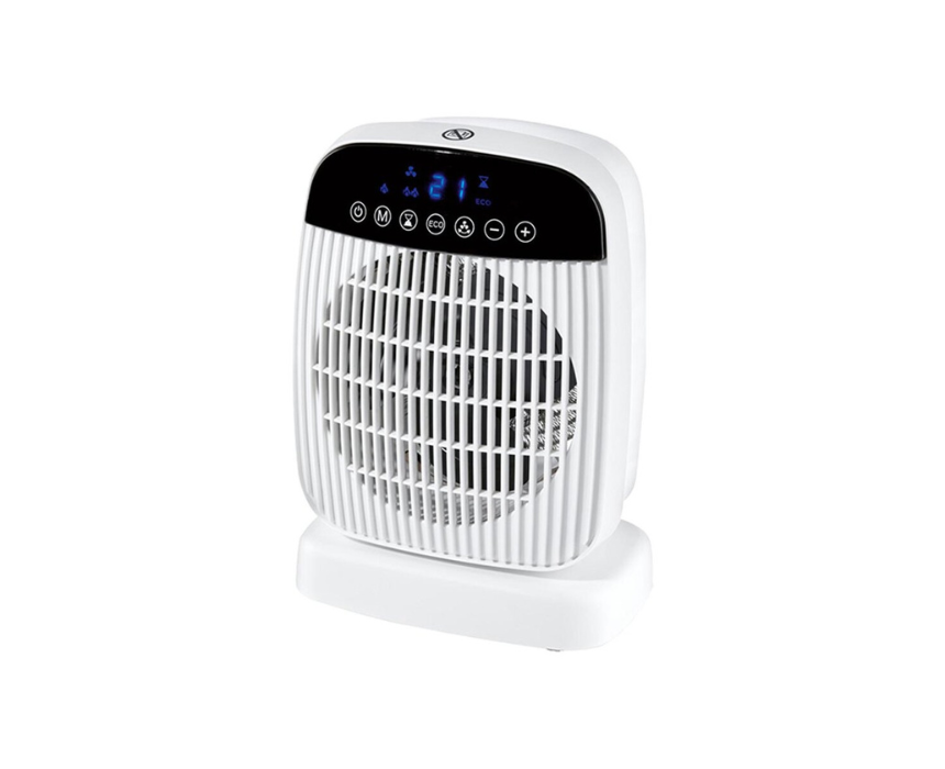 This 2000W fan heater with remote control offers adjustable heating with two power levels, 75° oscillation, and individually settable temperatures from 15–35 °C for optimal comfort. Features include tip-over and overheating protection, ECO mode, 24-hour timer, frost protection, and an LC display showing ambient temperature. Compact and convenient, it ensures safe and efficient heating for any room while allowing easy control from a distance.