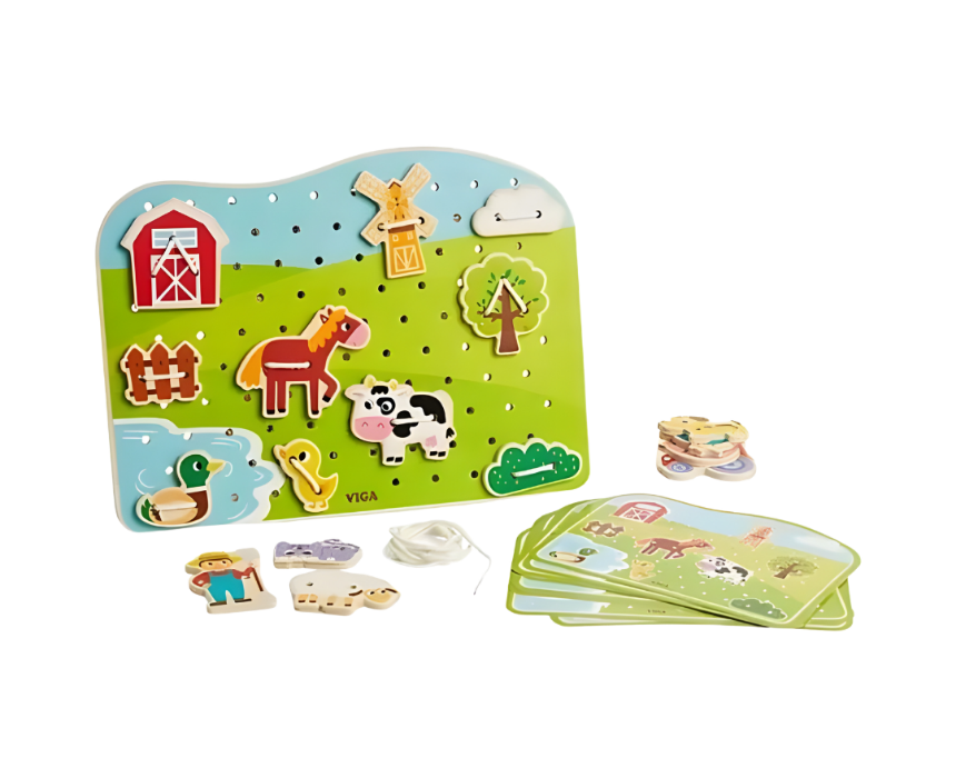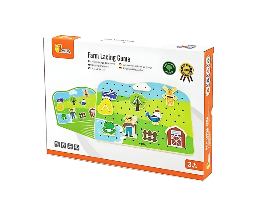 <p>The VIGA Farm Threading Toy is designed for ages 3 and above, introducing children to farm animals while supporting fine motor skills, shape recognition, and hand eye coordination. The set includes a wooden play board, 2D threading tiles, three threads, and five double sided template cards to guide creative play. Children can also use their imagination to create endless farm scenes, enhancing both learning and fun.</p>