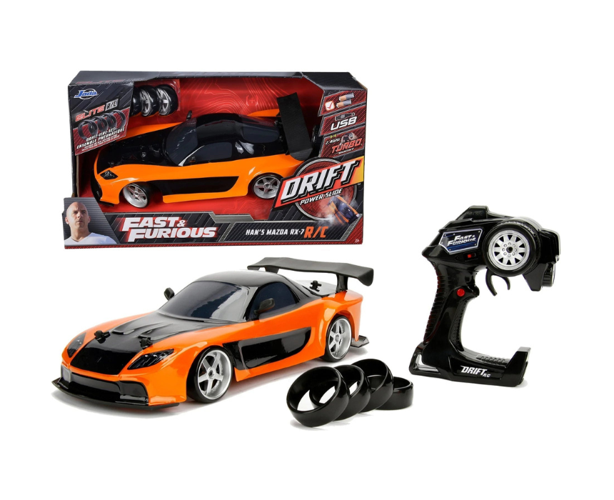 The Fast and Furious RC drift Mazda RX 7 1 10 features a powerful remote control system with turbo boost, drift mode, and four wheel drive for high speed performance. Designed with a precision controller, it offers smooth handling and stable control across different surfaces. Perfect for racing enthusiasts, it delivers exciting and dynamic driving action.
