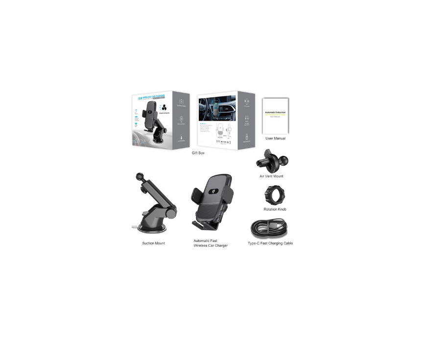 This dual coils automatic induction fast wireless car charger works with iPhone Samsung and all Qi enabled phones, providing stable fast charging with smart auto clamp induction for effortless one hand operation. Dual coil technology allows wide charging coverage for phones placed horizontally or vertically, and it includes flexible mounting options for dashboard windshield or air vent use, built from durable ABS PC materials for long lasting performance.