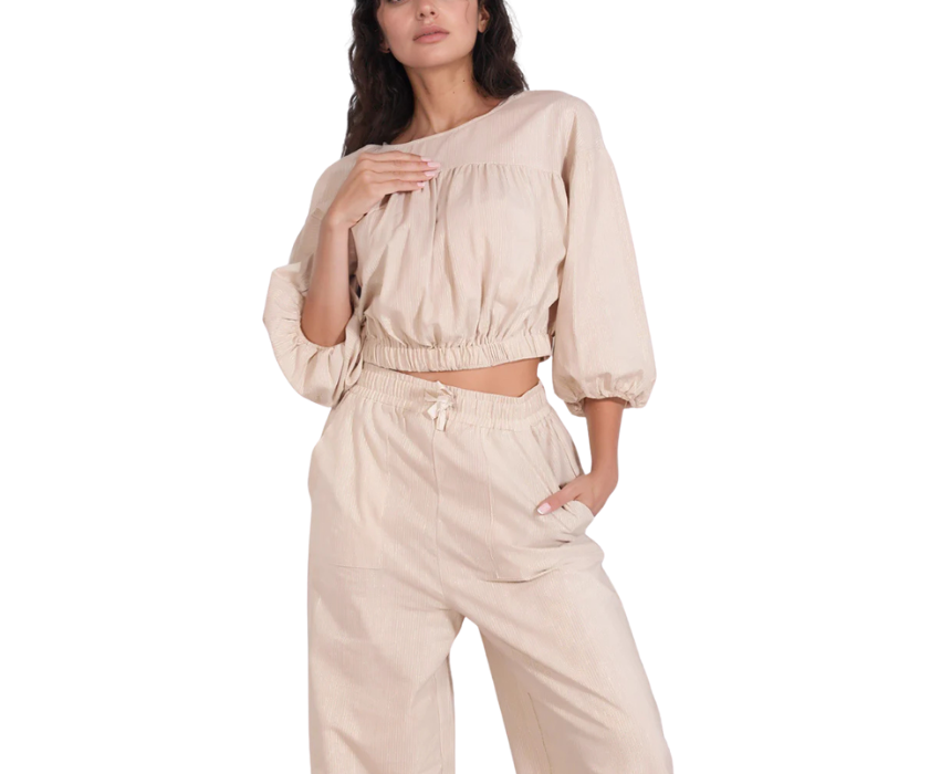 The Featherlight Duo Coord is a cotton-linen blend set that provides a fresh, airy fit for effortless style. Perfect for warm days or casual outings, pair it with sandals or sneakers and simple accessories for a relaxed, chic look. Made from linen and cotton, fabric care includes machine wash at 30°C, professional dry clean, medium-heat ironing, no bleaching, and do not tumble dry.