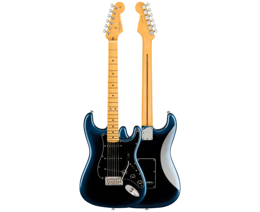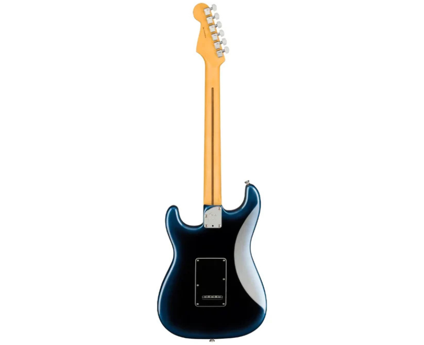 The Fender American Professional II Stratocaster in Dark Night features an alder body, Deep “C”-shaped maple neck with rolled fingerboard edges, 22 narrow-tall frets, and V-Mod II single-coil pickups for bell-like chime and versatile tone. It includes an upgraded 2-point tremolo with cold-rolled steel block, treble bleed circuit, and a deluxe molded hardshell case for protection. Ideal for professional players, it combines classic Strat playability with modern enhancements for comfort and performance.
