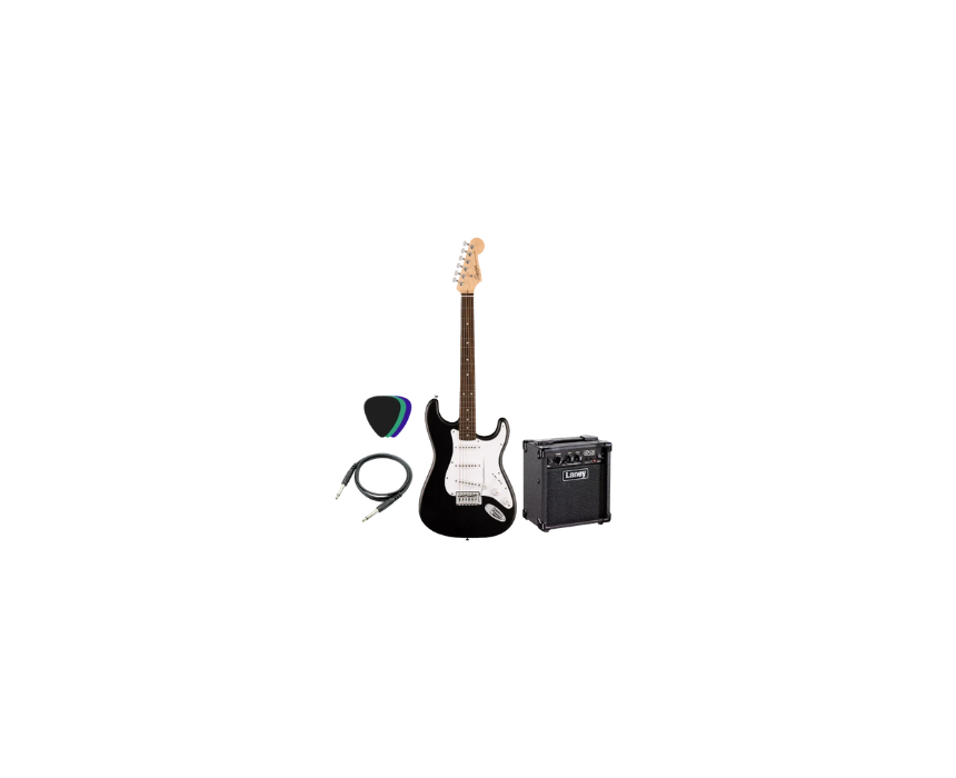 The Squier Debut Stratocaster Bundle provides beginners and advancing players with a full ready to play setup, featuring the iconic Strat design paired with a choice of Laney LX10 or Fender Frontman 10G amplifier for versatile tone. Offering reliable performance and comfortable playability, it suits practice, lessons, and stage use. It can be styled with any strap and pick choice to match the player’s comfort and playing style.
